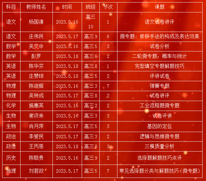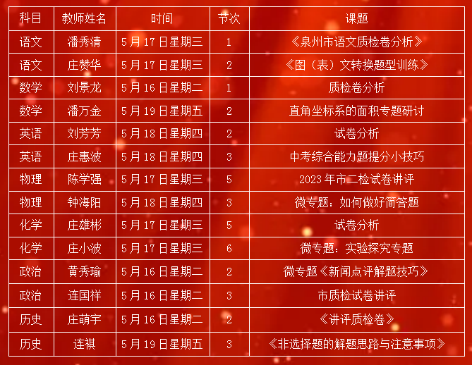 在中、高考倒计时之际,为了更好地准备考试方向,提高备考效率,踢好关键的“临门一脚”,创造中、高考佳绩,泉港二中于5月16日至19日开展了初、高三毕业班“临门一脚”微专题研讨活动。每个毕业班的每个备课组都安排了一节试卷分析课和一节微专题课,初三毕业班共有14节,高三毕业班共有15节。