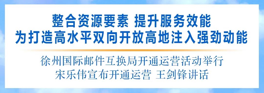 6月26日上午,徐州国际邮件互换局正式开通运营,标志着徐州双向开放高地建设迈出坚实步伐,将有力助推淮海经济区加速融入国内国际双循环。市委书记宋乐伟宣布国际邮件互换局开通运营,市委副书记、市长王剑锋讲话,南京海关一级巡视员顾忠盈,省商务厅二级巡视员强培,江苏邮政公司党委委员、副总经理丁永红,副市长吴卫东等出席开通运营活动。