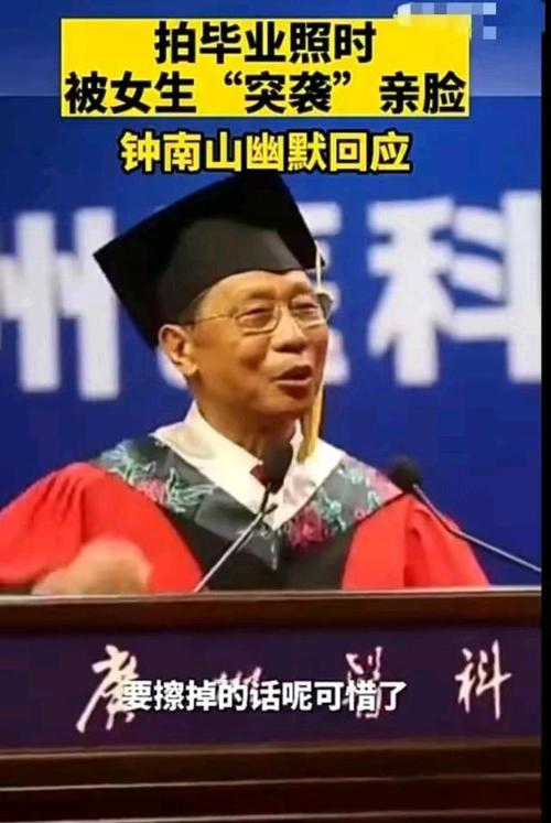 钟南山院士在毕业典礼上深情地说道:“看到同学们朝气蓬勃的状态,我很有感触。刚才我跟研究生一块儿照相,有一个女同学,挺漂亮的,还涂着口红,跟我照一张相,最后还亲了我一下。我觉得很开心也很暖心。我后来思想斗争了半天,要不要把它擦掉?要擦掉的话可惜了;要不擦掉,回头给老伴问‘你怎么回事儿’。我后来就擦掉了。但是我体会到,我们的广医的同学对老师、对母校的热爱!”
