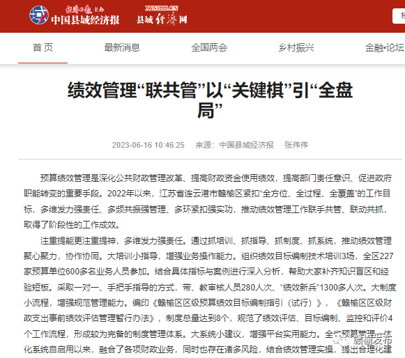 预算绩效管理是深化公共财政管理改革、提高财政资金使用绩效的重要手段。自2022年起,江苏省连云港市赣榆区紧紧围绕“全方位、全过程、全覆盖”的工作目标,多维发力强化责任、多频共振强化管理、多环紧扣强化实效,推动绩效管理工作联管共管、联动共抓,取得了阶段性工作成效。