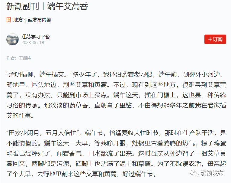 那剩下的几把艾草和黄蒿,父母把它挂在屋檐下和土墙上。在几个大晴天里,它们被晒干并妥善保存。盛夏夜晚,当家里没有蚊帐时,我会用几棵干艾草和黄蒿点燃来驱赶蚊虫。我躺在床上,睡得非常香甜。整个夏天,我既没有患上痱子,也没有被蚊虫叮咬留下任何红肿痒痛的痕迹。 作者单位:赣榆区青口镇人民政府。