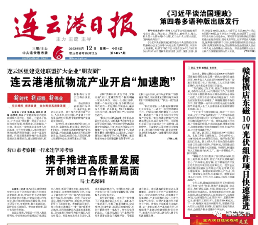 “赣榆区为项目提供了各项资源保障,包括土地资源、供电等,坚定了我们投资赣榆的信心。”尹海林说。据悉,位于赣榆经济开发区的光伏组件项目总投资高达50亿元,投资企业为横店集团东磁股份有限公司,该公司是全球最大的永磁铁氧体、软磁铁氧体材料生产企业。该项目一期占地281亩,建筑面积12.6万平方米,于今年1月开工建设,预计7月份建成投产。