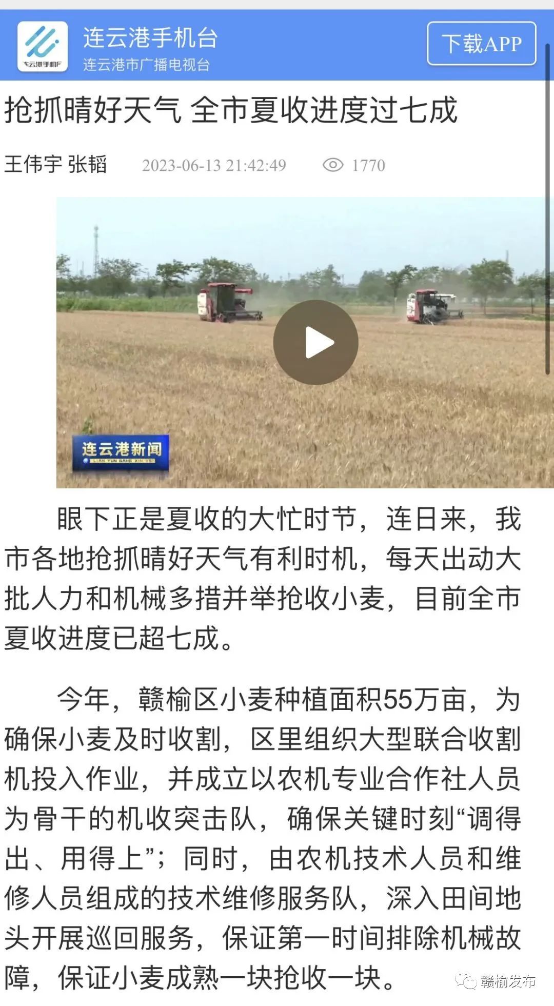 赣榆台《抢抓晴好天气 全市夏收进度过七成》。