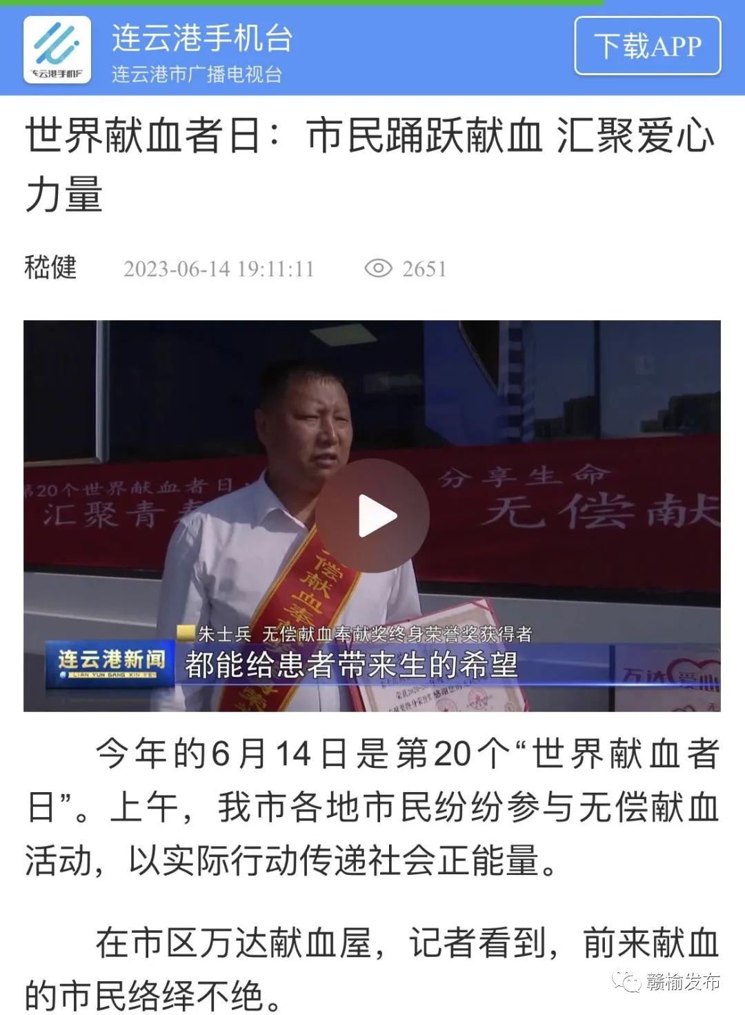 朱士兵,一位无偿献血奉献奖终身荣誉奖获得者,表示他已经献血了87次,总计3万余毫升。他认为每一次献血都能为患者带来生的希望。因此,他呼吁更多的人加入无偿献血的队伍中来。
